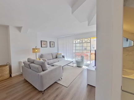 El amplio salón-comedor, con vistas a los jardines de la urbanización, se conecta con una la terraza de la vivienda a través de una galería acristalada.